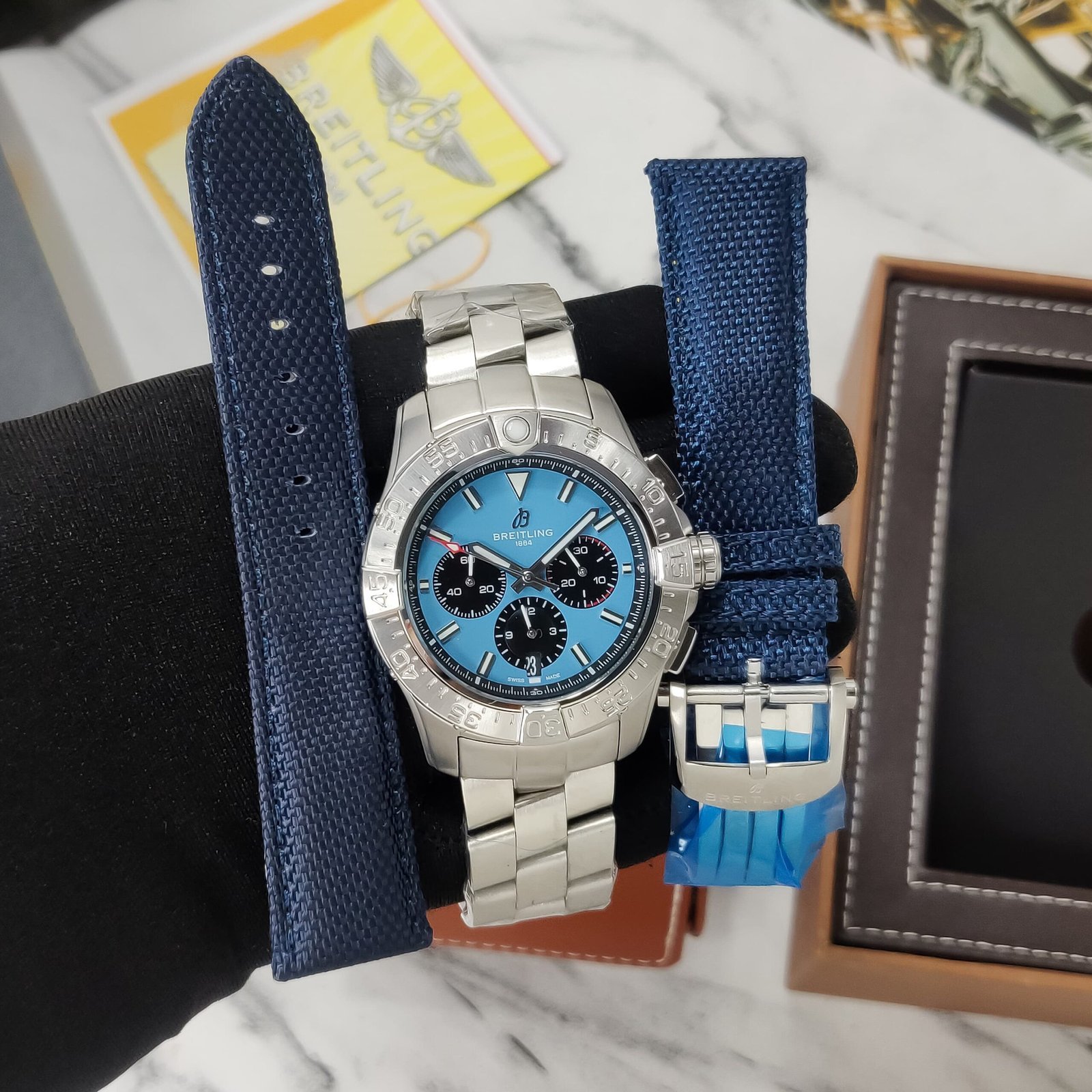 • Blue chronograph dial with stopwatch function