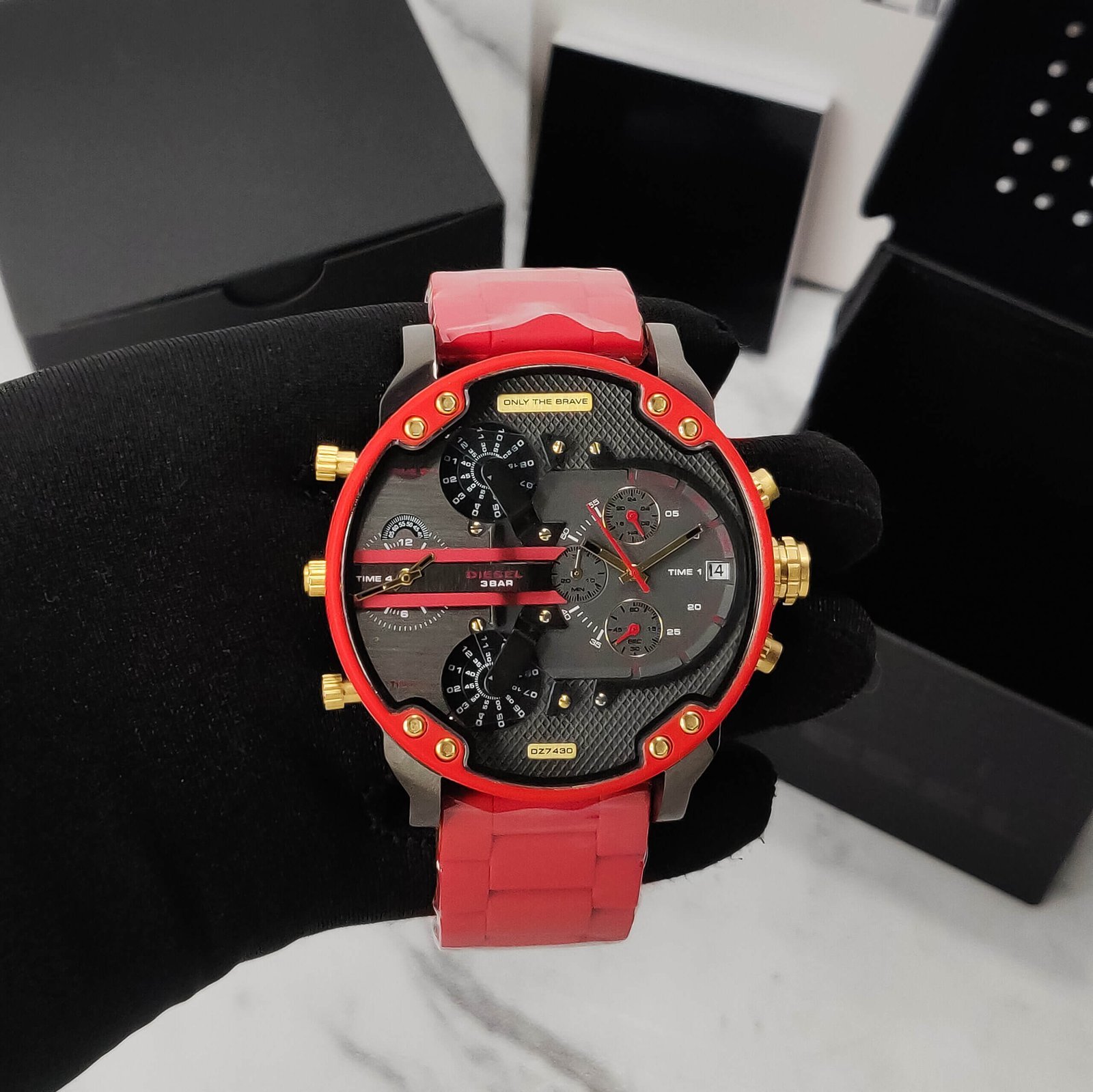 What sets the Diesel Big Daddy apart is its robust construction. The case is crafted from 100% stainless steel, promising not just durability but also a refined appearance that suits any occasion. The vivid red chain strap with a secure deployant clasp adds a touch of flair and comfort, making it an eye-catching accessory on your wrist.
