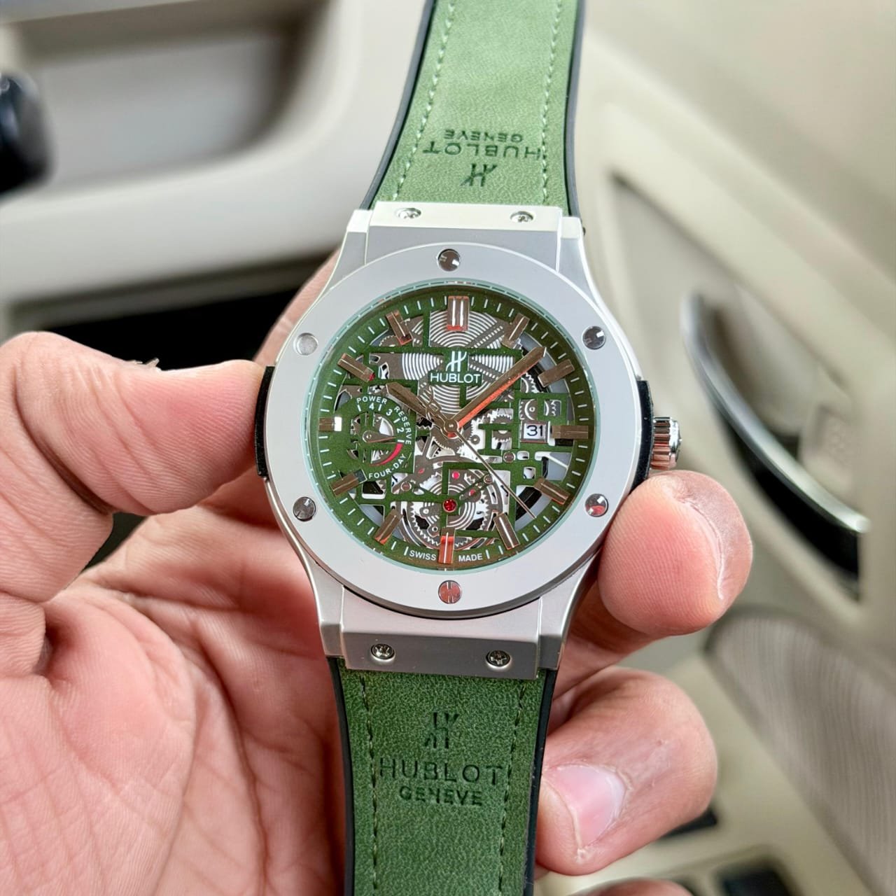 The Hublot Green Dial Quartz Chronograph is a striking timepiece that combines functionality with a bold design. The vibrant green dial, enhanced by a date window at 3 o’clock, captures attention while ensuring you stay organized. The silver bezel adds a touch of sophistication, making it versatile enough for both casual outings and formal events.